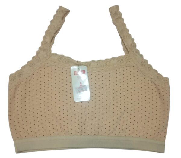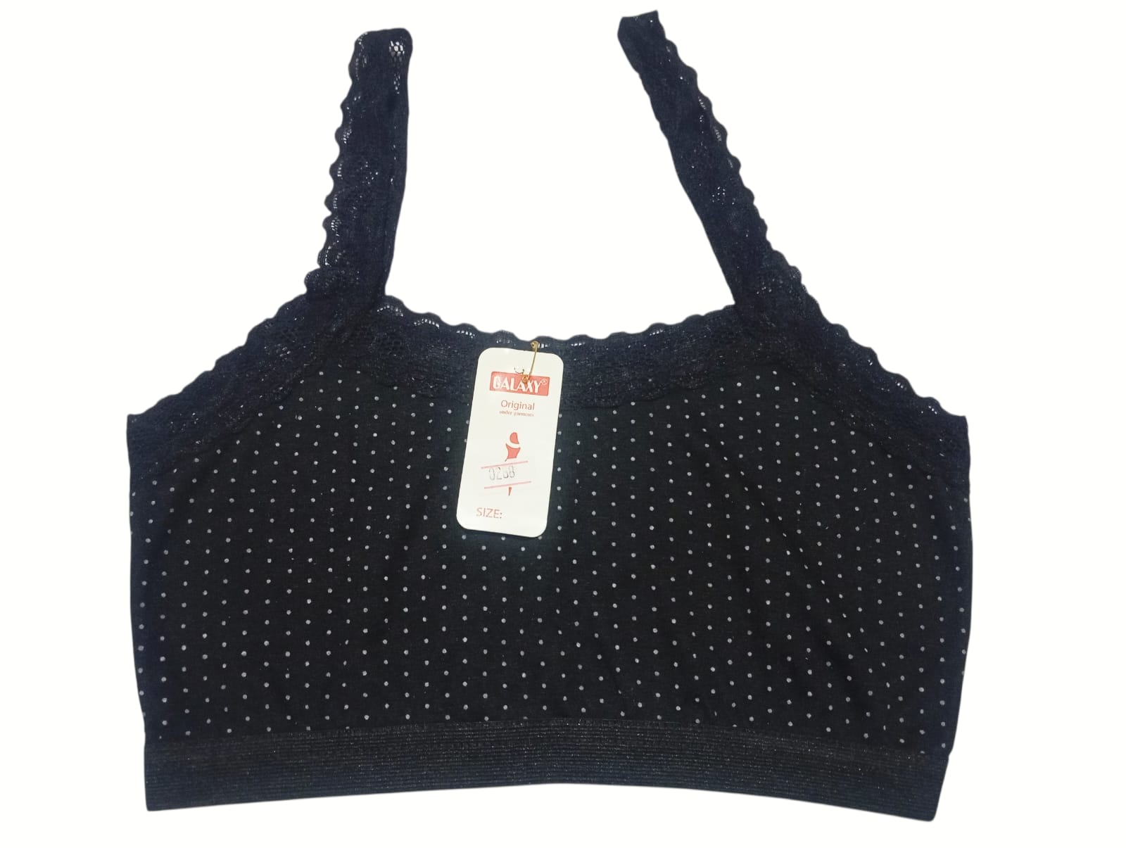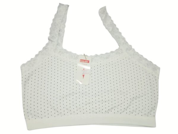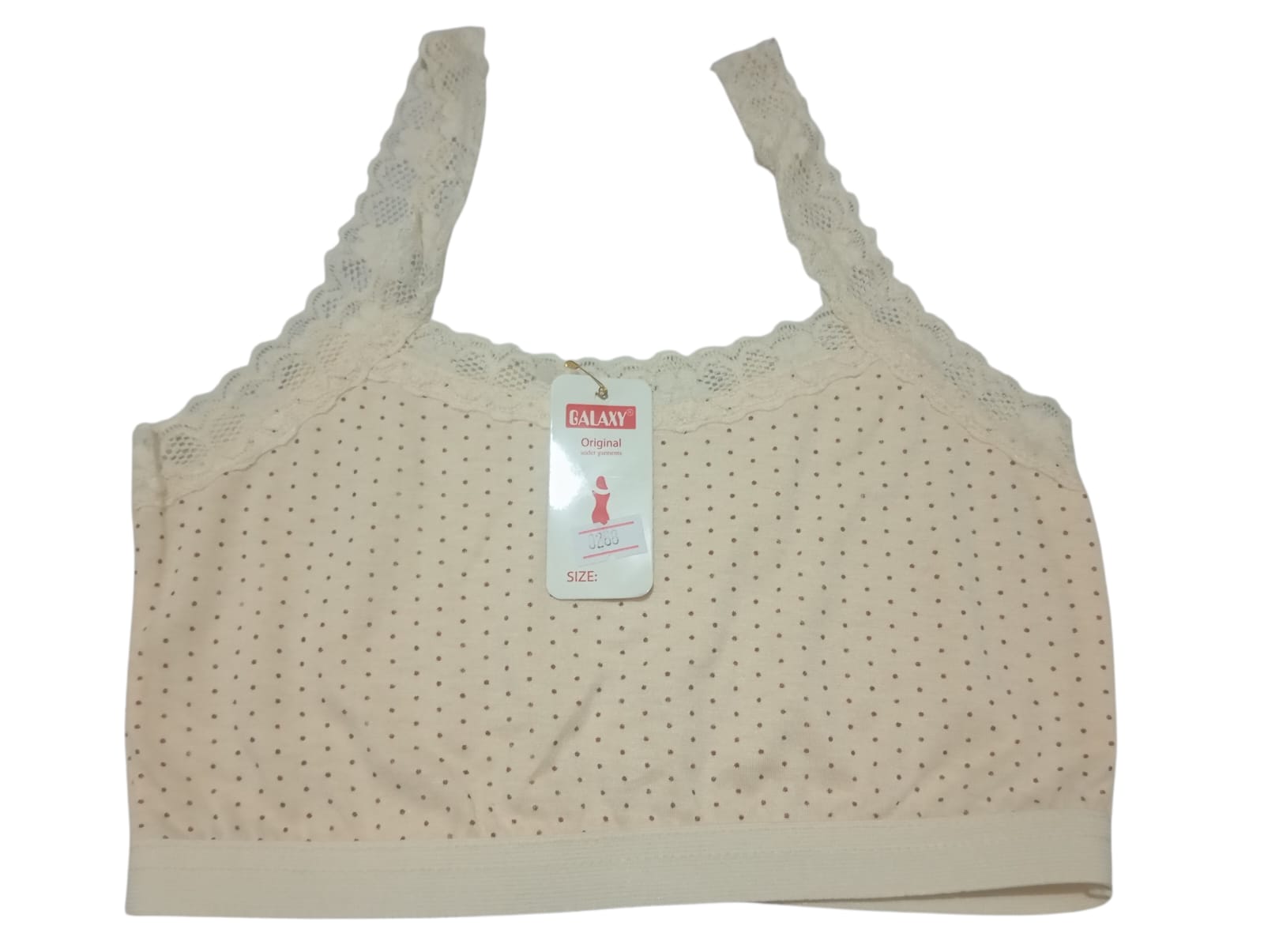 This teenage bra blends breathable cotton mix fabric with delicate lace detailing for a stylish yet comfortable fit. The camisole-style cut with thin straps is enhanced by lace trim along the neckline and straps, adding a touch of elegance to a practical everyday essential. Featuring a dotted pattern across the fabric, it offers both charm and durability. Available in versatile shades like white, black, and beige, this bra is designed to provide gentle support while maintaining a youthful, fashionable look. Ideal for teens seeking comfort with a hint of sophistication, it’s a perfect addition to any growing wardrobe.