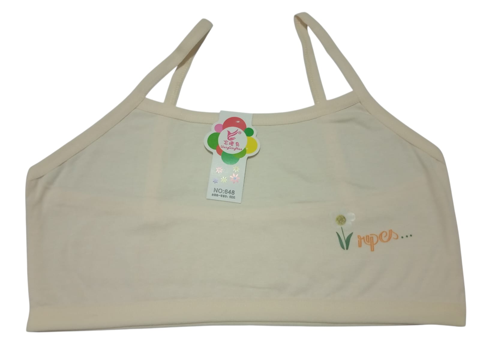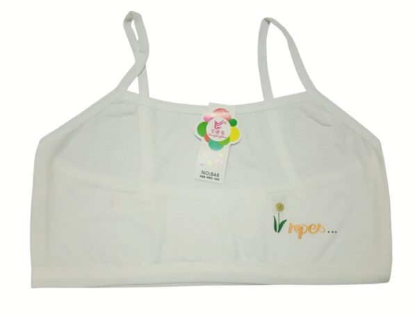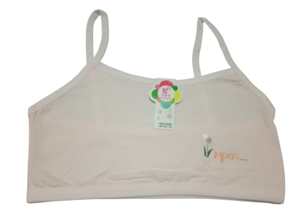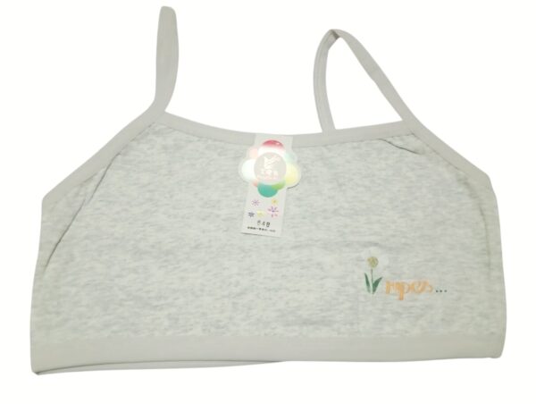 Made from a breathable cotton blend, this teenage camisole bra offers gentle support with a lightweight feel. Its simple design with thin straps ensures a natural fit under any outfit, while the soft pastel shades (white, cream, gray, and pink) add versatility to everyday wear. A small floral print detail on the lower side gives it a youthful, playful touch, making it more than just a basic undergarment. Perfect for teens beginning their lingerie journey, this bra combines comfort, durability, and subtle style for daily use.