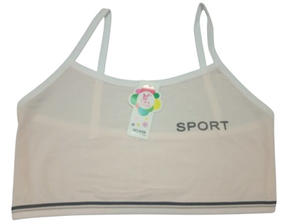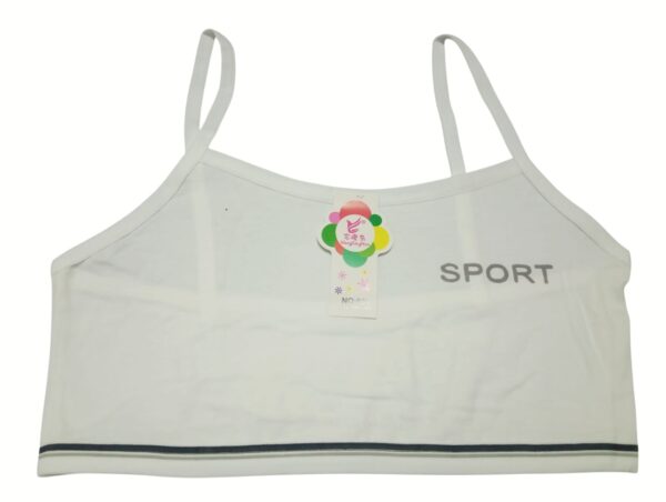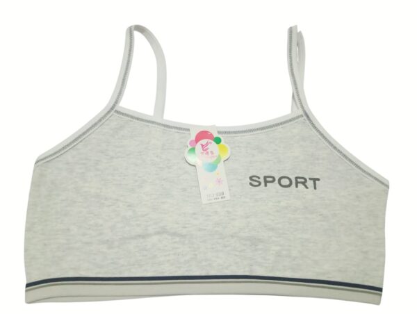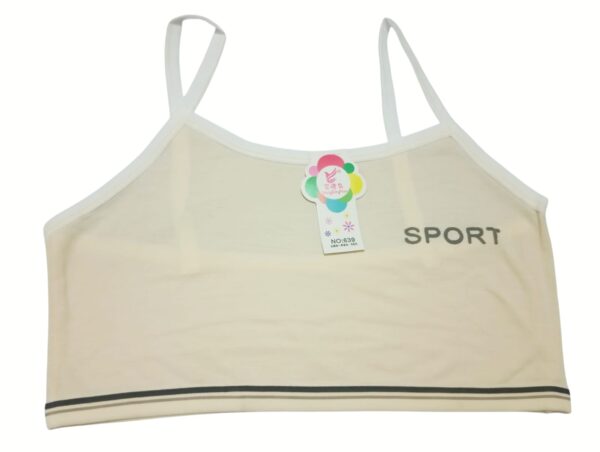Made from a breathable cotton blend, this teenage sports bra is designed for comfort and light activity. The camisole-style cut with thin straps ensures a natural fit, while the elastic band with a sleek stripe detail provides gentle support. Featuring the bold “SPORT” print across the front, it adds a trendy, youthful touch to everyday essentials. Available in versatile shades — white, gray, pink, beige, and cream — this bra is perfect for teens who want both practicality and style. Whether for school, casual wear, or light exercise, it offers durability, comfort, and a sporty vibe.